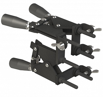 Выполнен из стали, окрашенной в черный цвет, с пластиковыми рукоятками. Зажим формы осуществляется при помощи шести штырей, которые вставляются в специальные отверстия в сварных формах, крепление при помощи специальных барашковых винтов. Держатель предназначен для больших сварных форм, состоящих из трёх частей.
